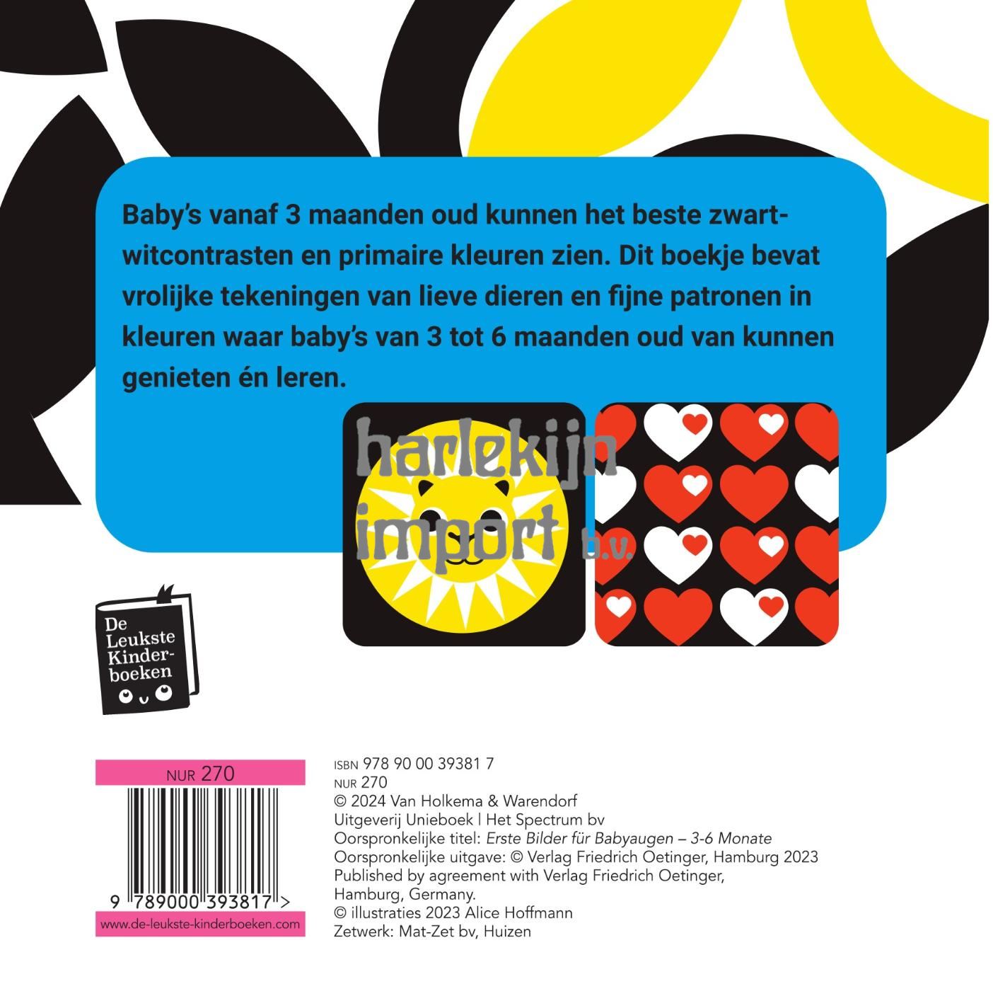 Kijk je mee, baby? Baby’s vanaf 3 maanden oud kunnen zwart-witcontrasten en primaire kleuren het beste zien. Dit boekje bevat vrolijke tekeningen van lieve dieren en fijne patronen in kleuren waar baby’s van 3 tot 6 maanden oud van kunnen genieten én leren. Met vijf prachtige patronen en vijf lieve dieren sluiten deze boekjes perfect aan bij het zicht en de ontwikkeling van elke baby! Is jouw kindje nog geen 3 maanden oud? Bekijk dan ook eens het eerste deel in deze reeks: Kijk je mee, baby? - 0-3 maanden.