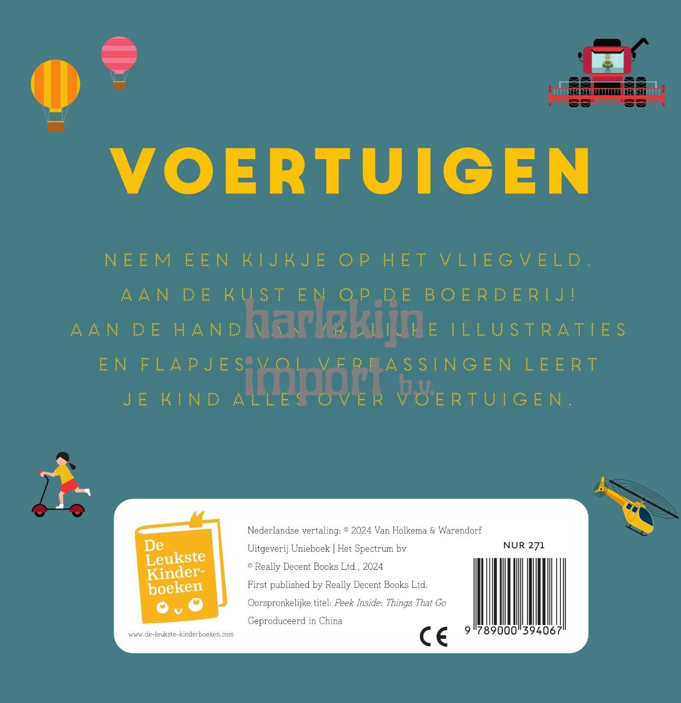 Vroem vroem, tringeling, tsjoeke tsjoeke! Zie je de step in de winkelstraat en de reddingsboot aan de kust? Hoor je de fluit van de stoomtrein? Bekijk de kleurrijke illustraties en ontdek samen meer dan honderd woorden over alle voertuigen om ons heen. Voertuigen is een kartonboek met afgeronde hoeken en stevige flappen waardoor dit kinderboek perfect is voor kinderen vanaf 18 maanden. Neem je peuter mee naar het station, de boerderij, de kust, de garage en het vliegveld. Aan de hand van vrolijke illustraties en flapjes vol verrassingen leert je kind alles over de voertuigen die je er aan kunt treffen.