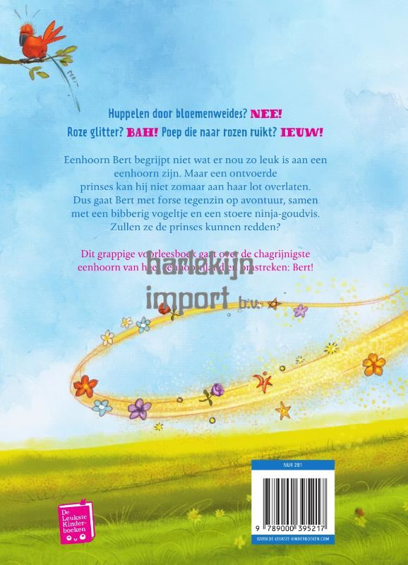 Alle eenhoorns aan de kant, want hier is BERT! Huppelen door bloemenweides, roze glitter en poep die naar rozen ruikt – eenhoorn Bert vindt het allemaal nogal gênant. Die hele eenhoorntrend mag van hem zó de prullenbak in. Waarom zou iemand ooit een eenhoorn willen zijn? Maar als er een prinses ontvoerd wordt, kan hij haar niet zomaar aan haar lot overlaten. Dus gaat Bert met forse tegenzin toch maar op avontuur, samen met een bibberig vogeltje en een stoere ninja-goudvis. Zullen ze de prinses kunnen redden? Dit grappige voorleesboek is het eerste deel in een hilarische serie over de chagrijnigste eenhoorn van heel eenhoornland en omstreken: Bert! Perfect voor eenhoorn- én NEE-hoornfans van 4 tot 99 jaar.