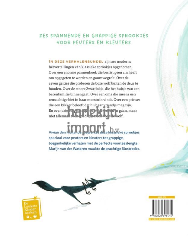 Zes moderne sprookjes voor peuters Vivian den Hollander bewerkte zes bestaande sprookjes naar een moderne versie speciaal voor peuters. Het verhaal van de pannenkoek die heel hard wegrent voordat hij opgegeten kan worden – maar uiteindelijk onverbiddelijk in de bek van de vos belandt. Van de zeven geitjes die per ongeluk de deur opendoen voor een hongerige wolf. Van de prinses die geholpen wordt door een galante kikker en hem belooft dat hij haar vriendje mag zijn. Van de stoere Zwartlokje, die in het huisje van drie beren terechtkomt en daar heerlijk in een bedje gaat slapen. Over een oma die ineens een reuzenbiet in haar moestuin vindt. En over de drie biggetjes, die elk een huisje bouwen. Maar zijn hun huisjes stevig genoeg om hen te beschermen tegen de grote boze wolf? Pas op voor de wolf! bevat zes hervertellingen van klassieke sprookjes. Fijne, toegankelijke verhalen voor peuters en kleuters, met de perfecte voorleeslengte voor het slapengaan. Marijn van der Wateren maakte de kleurrijke illustraties.