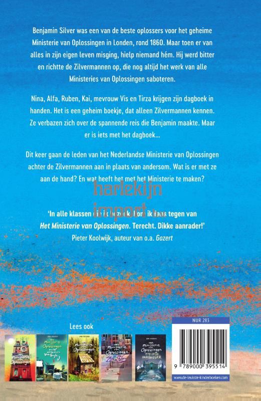 Het Ministerie van Oplossingen gaat achter de Zilvermannen aan… De leden van het Ministerie van Oplossingen krijgen het dagboek van Benjamin Silver in handen, de man die in de negentiende eeuw de Zilvermannen oprichtte, de grote vijand van het Ministerie. Het is een geheim boekje, dat alleen Zilvermannen kennen. Nina, Alfa, Ruben, Kai, mevrouw Vis en Tirza verbazen zich over de spannende reis die Benjamin maakte. Maar er is iets met het dagboek… Dit keer gaan de leden van het Nederlandse Ministerie van Oplossingen achter de Zilvermannen aan in plaats van andersom. Wat is er met ze aan de hand? En wat heeft het met het Ministerie te maken? Het Ministerie van Oplossingen en het dagboek van Benjamin Silver is het zesde los te lezen deel van de geliefde serie over het Ministerie van Oplossingen van Sanne Rooseboom. Mark Janssen maakte de leuke tekeningen. Voor jongens en meisjes vanaf 9 jaar. ‘In alle klassen die ik bezoek, kom ik fans tegen van Het Ministerie van Oplossingen. Terecht. Dikke aanrader!’ Pieter Koolwijk, auteur van o.a. Gozert ‘In het kader van onorthodoxe maatregelen stel ik voor dat elke ambtenaar, politicus en bestuurder Het Ministerie van Oplossingen leest, van Sanne Rooseboom.’ de Volkskrant
