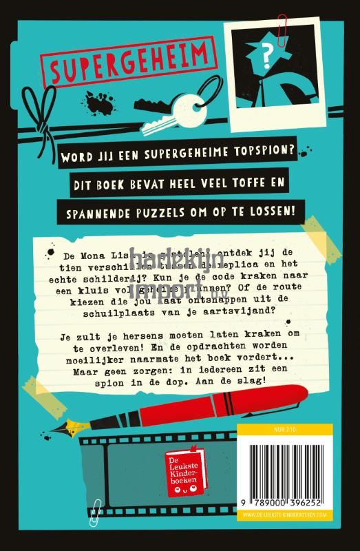 Word jij een supergeheime topspion? Dit boek bevat talloze hersenkrakende puzzels om op te lossen.De Mona Lisa is gestolen: ontdek jij de tien verschillen tussen de replica en het echte schilderij? Kun je de code kraken naar een kluis vol geheime plannen? Of de route kiezen die jou laat ontsnappen uit de schuilplaats van je aartsvijand?De puzzels dompelen jonge lezers onder in de wereld van spionage. Je zult je hersens moeten laten kraken om te overleven! De opdrachten worden moeilijker naarmate het boek vordert –lezers kunnen de puzzels, codes en mysteries oplossen en zich opwerken van beginnend spion tot meesterbrein. In iedereen zit een spion in de dop. Aan de slag!Het supergeheime spionnenpuzzelboek is perfect voor alle jonge codekrakers vanaf 9 jaar.