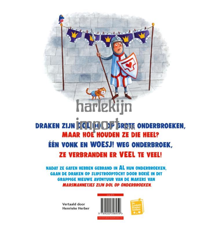 Een geestig prentenboek waar kinderen en hun ouders gegarandeerd om zullen lachen! Voor fans van Julia Donaldson, David Walliams en natuurlijk De ridder zonder billen.Draken zijn DOL op grote onderbroekenmaar HOE houden ze die heel? Eén vonkje en woesj! WEG is de onderbroek,ze VERBRANDEN er veel te veel!Wist jij dat draken dol zijn op onderbroeken? Ze dragen ze het liefst in de gekste kleuren en met de vrolijkste motiefjes. Maar door hun vuurspuwende adem zijn die prachtige onderbroeken steeds in no time verbrand. Gelukkig weten ze dat de koning van Boxië ook gek is op gekke onderbroeken, dus vliegen ze uit op een hilarisch avontuur, op zoek naar een vuurbestendige oplossing.
