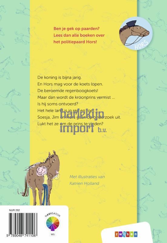 Stoere paardenserie op AVI M5 over het eigenzinnige politiepaard Hors en Soesja. De boeken zijn los van elkaar te lezen. In dit tweede deel lees je dat Hors inmiddels in training is als politiepaard en steeds serieuzere klussen mag doen. Maar dan wordt de kroonprins vermist. Zal het Hors lukken om hem te redden? Leuk om te lezen voor iedere jonge paardengek!