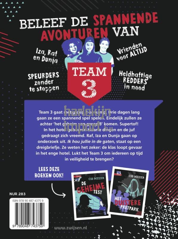 Spannende detectiveserie Team 3 van thrillerauteur Cis Meijer voor kinderen vanaf 9 jaar. Dit is het derde boek uit de serie. De eerste twee delen zijn met lovende woorden ontvangen. Beleef alle avonturen van Raf, Dunja en Iza. In Het gruwelijke hotel gaat Team 3 met groep 8 op kamp naar Texel. Drie dagen lang spelen ze er een spannend spel. Eindelijk zullen ze ‘het schoolgeheim’ weten dat alleen achtste groepers kennen. Supertof, hoewel Raf zwaar baalt dat zijn vader als hulpouder mee mag.