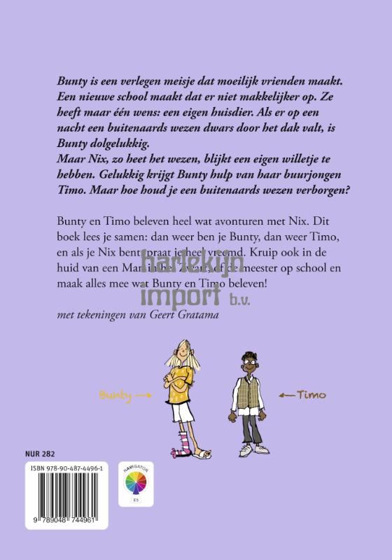 Bunty heeft maar één wens: een eigen huisdier. Dan valt er ’s nachts een lief en pluizig wezen door het dak. Bunty is dolgelukkig. Maar dan blijkt er iemand achter Nix aan te zitten. Hoe verstop je eigenlijk een buitenaards wezen?