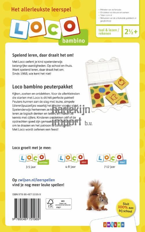 Kijken, zoeken en ontdekken. Voor de allerkleinsten die starten met Loco is dit hét perfecte pakket! Peuters gaan aan de slag met leuke, simpele (dieren)puzzeltjes waarbij het plezier voorop staat. Spelenderwijs herkennen ze kleuren en vormen, leren ze logisch denken en tellen en maken ze kennis met cijfers. Kinderen ontdekken zélf of de opdrachten goed zijn gemaakt door de basisdoos om te draaien en het patroon te controleren. Met Loco wordt oefenen een feest!Inhoud:• Loco bambino basisdoos• Opdrachtenboekje Loco bambino dierenpuzzels• Opdrachtenboekje Loco bambino rekenpuzzels• Loco informatiebrochureLeerdoelen:• Prikkelen van de fantasie• Ontdekken van kleuren en vormen• Tellen 1 t/m 6• Stimuleren van de ontluikende geletterd- en gecijferdheidMet het zelfcorrigerende Loco oefent je kind spelenderwijs belangrijke vaardigheden. Op school en thuis. Want spelend leren, daar draait het om. Sinds 1968, wie kent het niet!
