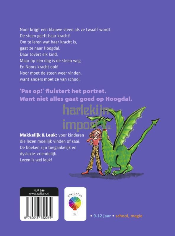 Noor krijgt een blauwe steen als ze twaalf wordt. De steen geeft haar kracht! Om te leren hoe ze haar kracht kan gebruiken, gaat Noor naar Hoogdal. Daar tovert of vliegt elk kind. Maar op een dag is de steen weg. En Noors kracht ook! Heeft Merel haar steen gestolen? Noor moet de steen weer vinden, want anders moet ze van school. Je zou maar echt kunnen toveren, net zoals Noor. Op Hoogdal kunnen alle kinderen vliegen en hebben ze speciale krachten. Toen ze 12 werd kreeg Noor een bijzondere steen, maar nu is hij weg… Dit spannende verhaal van Marlies Slegers voor kinderen van 9-12 jaar is moeilijk weg te leggen, ook als lezen niet vanzelf gaat. De spannende illustraties van Hélène Jorna maken de betovering compleet! De ‘Makkelijk en Leuk’ serie helpt kinderen met dyslexie of een leesachterstand om lezen weer leuk te maken met verhalen die aansluiten bij hun belevingswereld.