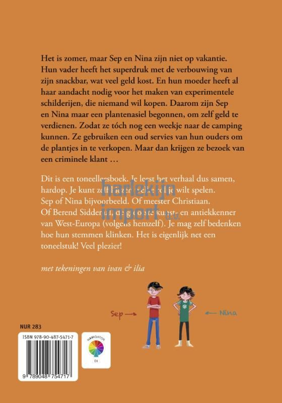Het is zomer, maar Sep en Nina zijn niet op vakantie. Hun vader heeft het superdruk met de verbouwing van zijn snackbar, wat veel geld kost. En hun moeder heeft al haar aandacht nodig voor het maken van experimentele schilderijen, die niemand wil kopen. Daarom zijn Sep en Nina maar een plantenasiel begonnen om zelf geld te verdienen, zodat ze tóch nog een weekje naar de camping kunnen. Ze lenen een oud servies van hun ouders om de plantjes in te verkopen. Maar dan krijgen ze bezoek van een criminele klant … Dit is een toneelleesboek. Je leest het verhaal dus samen, hardop. Kies zelf welke rol je speelt. Sep of Nina bijvoorbeeld. Of Meester Christiaan. Of Berend Sidderaal, de grootste kunst- en antiekkenner van West-Europa (volgens zichzelf). Je mag zelf bedenken hoe hun stemmen klinken. Het is eigenlijk net een toneelstuk! Veel plezier!