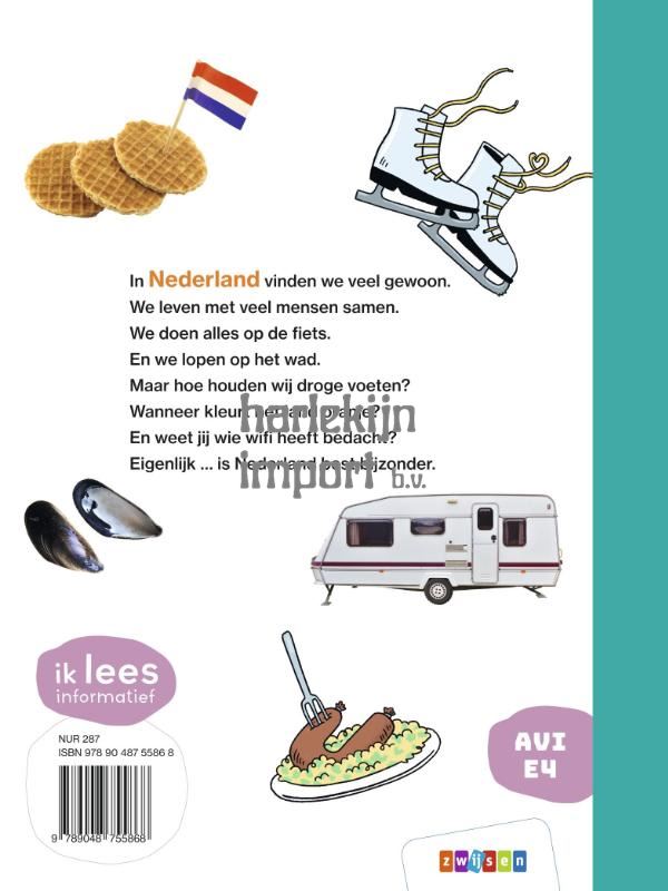 In Nederland vinden we veel gewoon. We leven met veel mensen samen. We doen alles op de fiets. En we lopen op het wad. Maar hoe houden wij droge voeten? Wanneer kleurt het land oranje? En weet jij wie wifi heeft bedacht? Eigenlijk … is Nederland best bijzonder. In dit boek uit de serie ik lees informatief ontdekken beginnende lezers wat Nederland zo bijzonder maakt! Van typisch Nederlandse dingen en gewoontes tot bekende Nederlanders. Van lekkere pannenkoeken tot voetbalkampioenen, van Koningsdag tot Sinterklaas, en van Rembrandt tot DJ Tiësto. Het boek staat boordevol verrassende weetjes, grappige raadsels, moppen en veel foto’s en vrolijke tekeningen die lezen nog leuker maken!