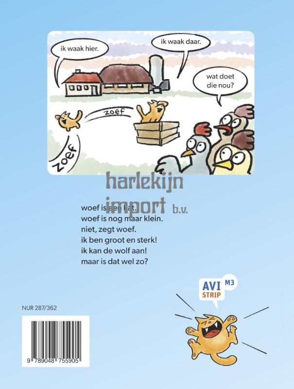 woef is een kat. woef is nog maar klein. niet, zeg woef. ik ben groot en sterk! ik kan de wolf aan! maar is dat wel zo? Miauw! Ehh… ik bedoel Woef! Woef is een kat, maar voelt zich meer een hond. Niet zomaar een hond, maar een grote stoere hond. Een hond die voor niks of niemand bang is, zelfs niet voor een wolf. De kippen kijken verbaasd toe … hoe zou het Woef de kat vergaan op avontuur? Dit absurde en grappige verhaal is in stripvorm geschreven. Beginnende lezers vinden het fijn om stripverhalen te lezen, de vrolijke illustraties helpen hen namelijk om het verhaal te begrijpen en om nieuwe woorden te leren. Margreet de Heer bedacht dit leuke verhaal dat bij beginnende lezers in de smaak zal vallen. Leesniveau: AVI M3