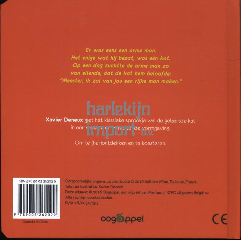 Er was eens een arme man. Het enige wat hij bezat, was een kat. Op een dag zuchtte de arme man zo van ellende, dat de kat hem beloofde: “Meester, ik zal van jou een rijke man maken.” Xavier Deneux giet het klassieke sprookje van de gelaarsde kat in een speelse en verrassende vormgeving. Om te (her)ontdekken en te koesteren.