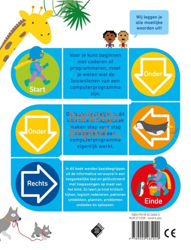 Voor je kunt beginnen met coderen of programmeren, moet je weten wat de bouwstenen van een computerprogramma zijn. De leuke spelletjes in dit interactieve flapjesboek maken stap voor stap duidelijk hoe een computerprogramma eigenlijk werkt. In dit boek worden basisbegrippen uit de informatica verwoord in een toegankelijke taal en geïllustreerd met toepassingen op maat van het kind. Zo leert je kind kritisch kijken, logisch redeneren, patronen ontdekken, plannen, problemen ontleden én oplossen.