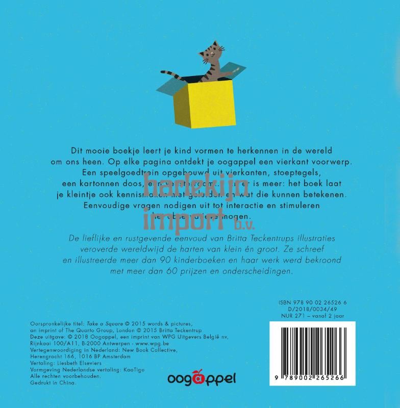 Dit mooie boekje leert je kind vormen te herkennen in de wereld om ons heen. Op elke pagina ontdekt je oogappel een vierkant voorwerp. Een speelgoedtrein opgebouwd uit vierkanten, stoeptegels, een kartonnen doos, een vensterraam… En er is meer: het boek laat je kleintje ook kennismaken met geluiden en wat die kunnen betekenen. Eenvoudige vragen nodigen uit tot interactie en stimuleren het observatievermogen. De lieflijke en rustgevende eenvoud van Britta Teckentrups illustraties veroverde wereldwijd de harten van klein én groot. Ze schreef en illustreerde meer dan 90 kinderboeken en haar werk werd bekroond met meer dan 60 prijzen en onderscheidingen.