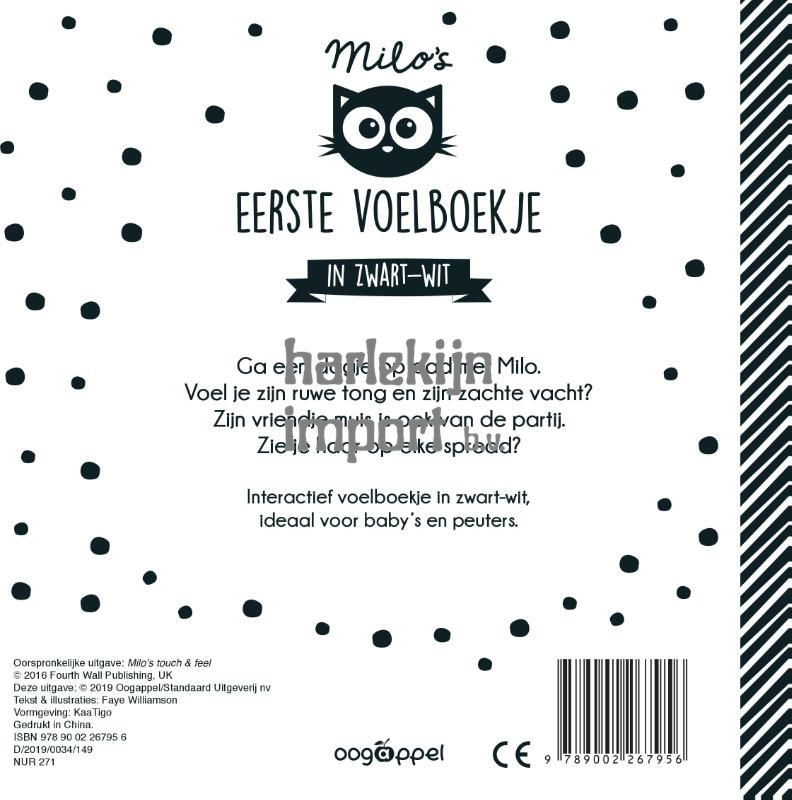 Ga een dagje op pad met Milo. Voel je zijn ruwe tong en zijn zachte vacht? Zijn vriendje muis is ook van de partij. Zie je haar op elke spread? Interactief voelboekje in zwart-wit, ideaal voor baby’s en peuters.