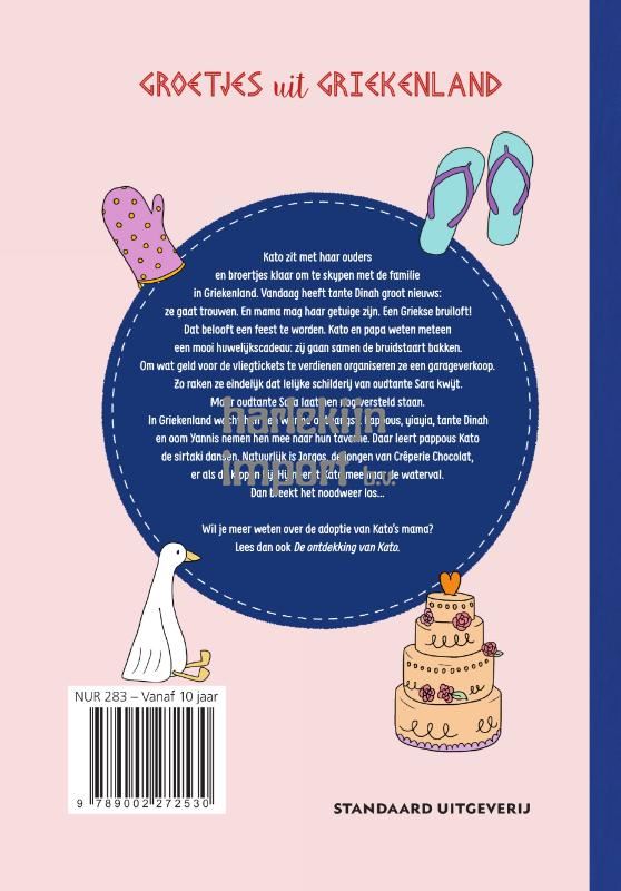 Kato zit met haar ouders en broertjes klaar om te skypen met de familie in Griekenland. Vandaag heeft tante Dinah groot nieuws: ze gaat trouwen. En mama mag haar getuige zijn. Een Griekse bruiloft! Dat belooft een feest te worden. Kato en papa weten meteen een mooi huwelijkscadeau: z? gaan samen de bruidstaart bakken. Om wat geld voor de vliegtickets te verdienen organiseren ze een garageverkoop. Zo raken ze eindelijk dat lelijke schilderij van oudtante Sara kwijt. Maar oudtante Sara laat hen nog versteld staan. In Griekenland wacht hen een warme ontvangst. Pappous, yiayia, tante Dinah en oom Yannis nemen hen mee naar hun taverne. Daar leert pappous Kato de sirtaki dansen. Natuurlijk is Jorgos, de jongen van Crêperie Chocolat, er als de kippen bij. Hij neemt Kato mee naar de waterval. Dan breekt het noodweer los…