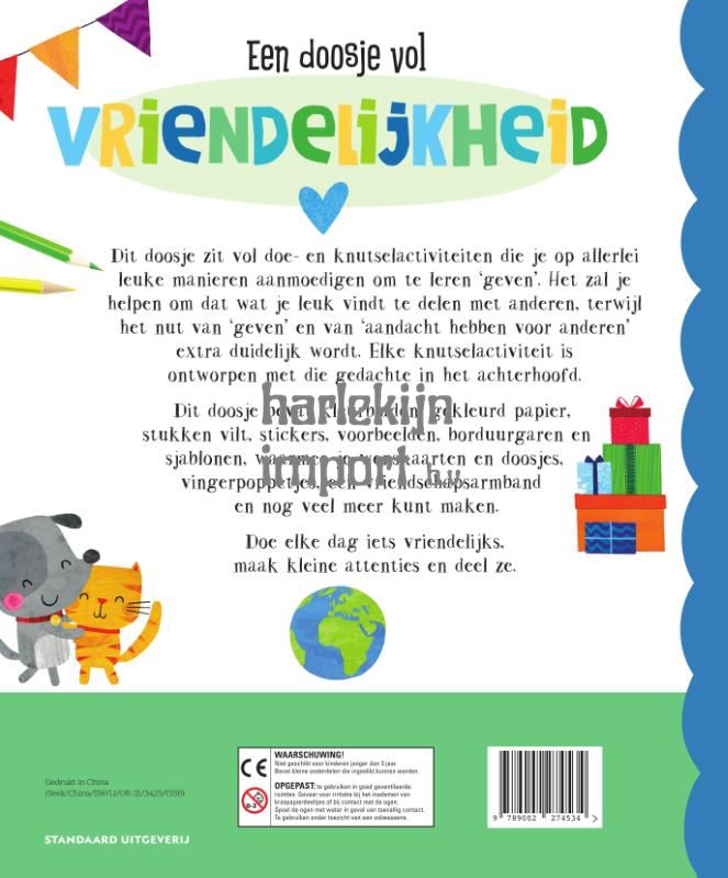 Dit doosje zit vol doe- en knutselactiviteiten die je op allerlei leuke manieren aanmoedigen om te leren ‘geven’. Het zal je helpen om dat wat je leuk vindt te delen met anderen, terwijl het nut van ‘geven’ en van ‘aandacht hebben voor anderen’ extra duidelijk wordt. Elke knutselactiviteit is ontworpen met die gedachte in het achterhoofd. Dit doosje bevat kleurbladen, gekleurd papier, stukken vilt, stickers, voorbeelden, borduurgaren en sjablonen, waarmee je wenskaarten en doosjes, vingerpoppetjes, een vriendschapsarmband en nog veel meer kunt maken. Doe elke dag iets vriendelijks, maak kleine attenties en deel ze.