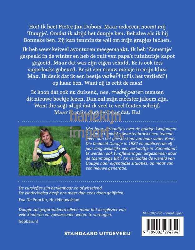 Hoi! Ik heet Pieter-Jan Dubois. Maar iedereen noemt mij ‘Duupje’. Omdat ik altijd het duupje ben. Behalve als ik bij Bonneke ben. Zij kan tenminste wél om mijn grapjes lachen. Ik heb weer keiveel avonturen meegemaakt. Ik heb ‘Zomertje’ gespeeld in de winter en heb de ruit van papa’s tuinhuisje kapot gegooid. Maar dat was zijn eigen schuld. Er is ook iets superleuks gebeurd. Er zit een nieuw meisje in mijn klas: Max. Ik denk dat ik een beetje verlieft (of is het verliefd?) op haar ben. Want zij is echt de max! Ik hoop dat ook nu duizend, nee, mieliejoenen mensen dit nieuwe boekje lezen. Dan zal mijn meester jaloers zijn. Want die zegt altijd dat ik veel te veel fouten schrijf. Maar in mijn dagboek mag dat. Ha!