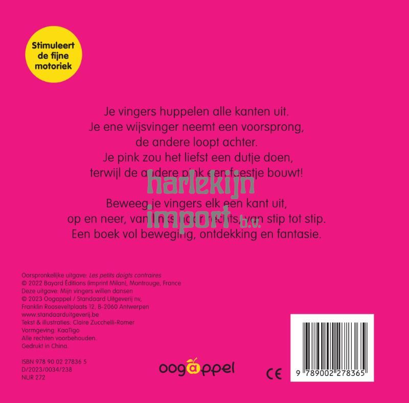 Je vingers huppelen alle kanten uit. Je ene wijsvinger neemt een voorsprong, de andere loopt achter. Je pink zou het liefst een dutje doen, terwijl de andere pink een feestje bouwt! Beweeg je vingers elk een kant uit, op en neer, van links naar rechts, van stip tot stip. Een boek vol beweging, ontdekking en fantasie. Stimuleert de fijne motoriek.