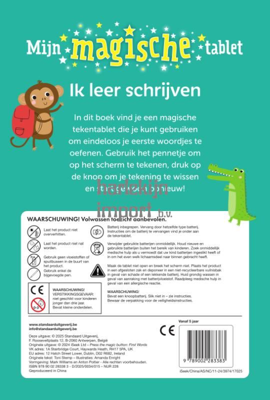 In dit boek vind je een magische tekentablet die je kunt gebruiken om eindeloos letters en woorden te oefenen.Lees de opdrachtjes in het boek en gebruik het pennetje om op het scherm te tekenen en te schrijven. Foutje gemaakt? Druk op de knop om je tablet te wissen en start gewoon opnieuw!
