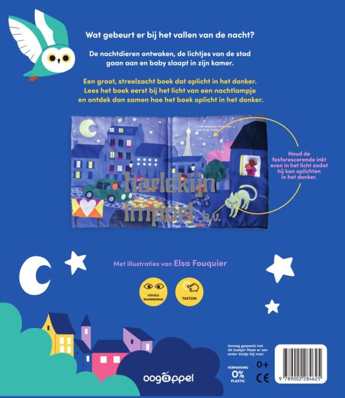 Wat gebeurt er bij het vallen van de nacht? De nachtdieren ontwaken, de lichtjes van de stad gaan aan en baby slaapt in zijn kamer. Een groot, streelzacht boek dat oplicht in het donker.Lees het boek eerst bij het licht van een nachtlampje en ontdek dan samen hoe het boek oplicht in het donker.