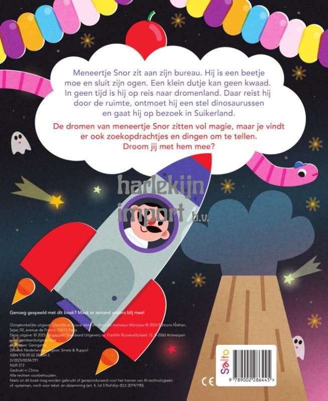 Meneertje Snor zit aan zijn bureau. Hij is een beetje moe en sluit zijn ogen. Een klein dutje kan geen kwaad. In geen tijd is hij op reis naar dromenland. Daar reist hij door de ruimte, ontmoet hij een stel dinosaurussen en gaat hij op bezoek in Suikerland. De dromen van meneertje Snor zitten vol magie, maar je vindt er ook zoekopdrachtjes en dingen om te tellen. Droom jij met hem mee?