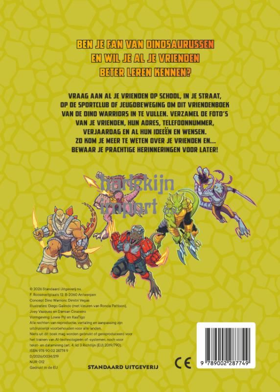 Ben je fan van dinosaurussen en wil je al je vrienden beter leren kennen? Vraag aan al je vrienden op school, in je straat, op de sportclub of jeugdbeweging om dit vriendenboek van de Dino Warriors in te vullen. Verzamel de foto’s van je vrienden, hun adres, telefoonnummer, verjaardag en al hun ideeën en wensen. Zo kom je meer te weten over je vrienden en… bewaar je prachtige herinneringen voor later!