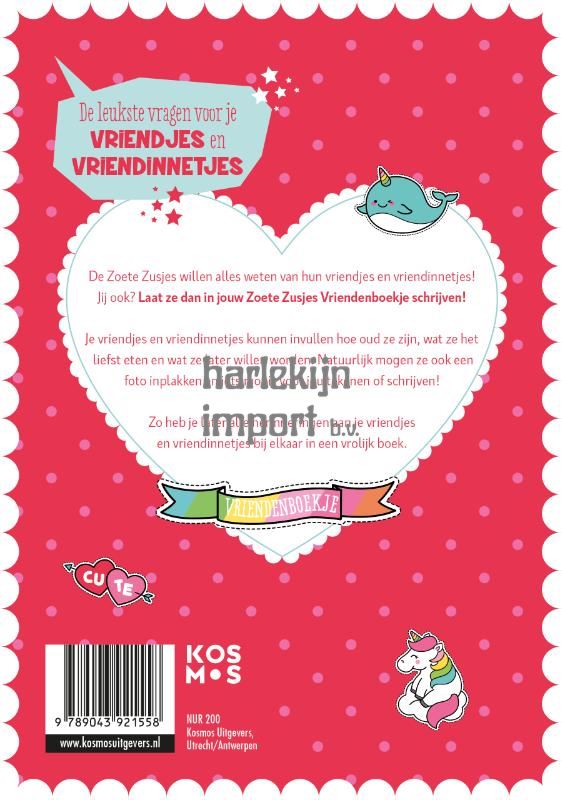 De Zoete Zusjes hebben nu een hun eigen vriendenboekje! Dit is een vervolg op hun eerste boek: Woensdagmiddag met De Zoete Zusjes. Een album voor de mooiste herinneringen aan klasgenoten en vrienden. In dit vriendenboek kunnen kleuters een heleboel grappige weetjes over zichzelf vertellen. Daarna kunnen ze met stiften en kleurpotloden aan de slag om de kleurplaat om te toveren tot een pareltje. Bovendien is er plaats voor een foto: leuk voor later! De kleurplaten en de meerkeuzevragen maken dit vriendenboek net anders dan de rest!