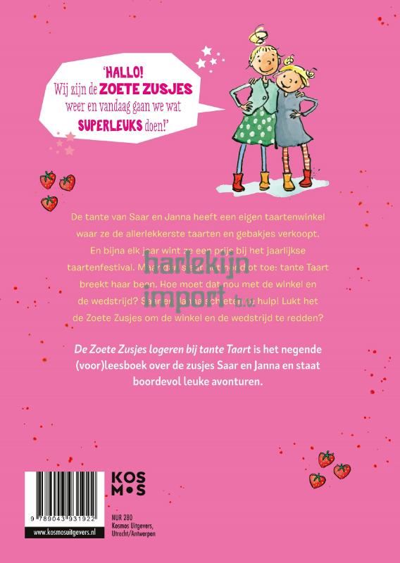 In ‘De Zoete Zusjes logeren bij tante Taart’, geschreven door Hanneke de Zoete, schieten Saar en Janna hun tante hulp. Die heeft namelijk een eigen taartenwinkel waar ze de allerlekkerste taarten en gebakjes verkoopt. En elk jaar wint ze de eerste prijs bij het jaarlijkse taartenfestival. Bij tante Taart logeren is het leukste wat er is! Maar dan slaat het noodlot toe: tante Taart breekt haar been. Hoe moet dat nou met het logeerpartijtje, de winkel en de wedstrijd? Saar en Janna gaan samen met mama logeren in het superroze en zoete huis van tante Taart dat aan de winkel vast zit. Met de hulp van mama en het geheime taartrecept van tante Taart gaan ze de allermooiste regenboogtaart bakken voor de taartenwedstrijd. En ondertussen proberen ze ook nog de lekkerste cupcakes, crompoucen en gebakjes te verkopen in de winkel zodat die niet dicht hoeft. Lukt het de Zoete Zusjes om de winkel en de wedstrijd te redden? Een heerlijk boek om voor te lezen vanaf 4 jaar of voor kinderen vanaf 7 jaar die zelf willen lezen. De uitvoering van dit (voorlees)boek is mooi gebonden, vrolijk geïllustreerd door Iris Boter en met glitters op het omslag. Dat maakt dit boek ook een perfect cadeau voor elk kind. Ter gelegenheid van een verjaardag, diploma, verhuizing, Sinterklaas, Kerstmis, of gewoon zomaar.