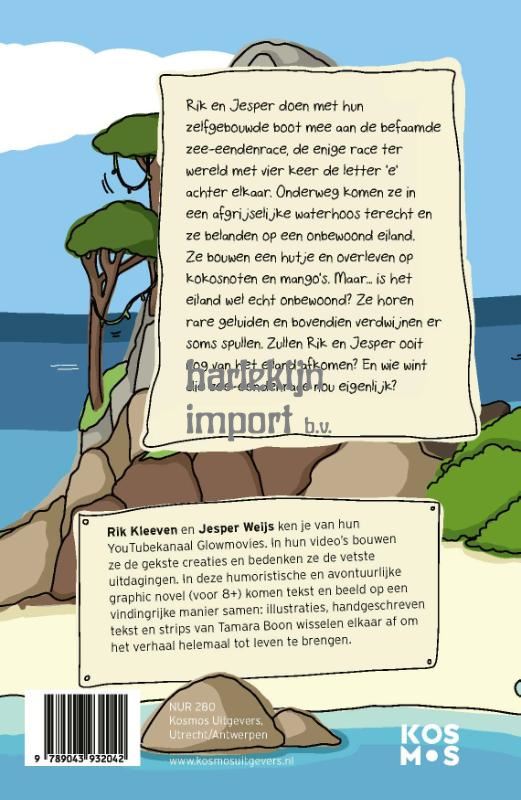 Rik Kleeven en Jesper Weijs ken je van hun YouTubekanaal Glowmovies. In hun video’s bouwen ze de gekste creaties en bedenken ze de vetste uitdagingen. In hun tweede kinderboek ‘Rik en Jesper overleven op een onbewoond eiland’ beleven ze weer de bizarste avonturen. Rik en Jesper doen namelijk met hun zelfgebouwde boot mee aan de befaamde zee-eendenrace, de enige race ter wereld met vier keer de letter ‘e’ achter elkaar. Onderweg komen ze in een afgrijselijke waterhoos terecht en ze belanden op een onbewoond eiland. Ze bouwen een hutje en overleven op kokosnoten en mango’s. Maar… is het eiland wel echt onbewoond? Ze horen rare geluiden en bovendien verdwijnen er soms spullen. Zullen Rik en Jesper ooit nog van het eiland afkomen? En wie wint die zee-eendenrace nou eigenlijk? In deze humoristische en avontuurlijke graphic novel komen tekst en beeld op een vindingrijke manier samen: illustraties, handgeschreven tekst en strips van Tamara Boon wisselen elkaar af om het verhaal helemaal tot leven te brengen.