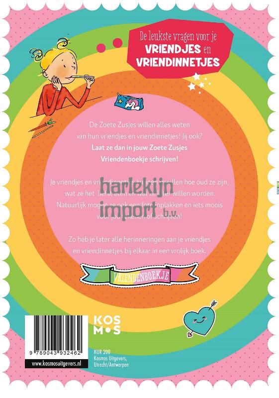 Dit is hét vriendenboekje van de Zoete Zusjes! Een album voor de mooiste herinneringen aan klasgenoten en vrienden. In dit vriendenboek kunnen je klasgenoten, vrienden, familie en sportmaatjes een heleboel grappige weetjes over zichzelf vertellen. Daarna kunnen ze met stiften en kleurpotloden aan de slag om de kleurplaat om te toveren tot een pareltje. Bovendien is er plaats voor een foto: leuk voor later! De kleurplaten en de meerkeuzevragen maken dit vriendenboek net anders dan de rest. De Zoete Zusjes Saar en Janna hebben natuurlijk ook een bladzijde ingevuld. Creëer een album vol leuke herinneringen. Dit vriendenboek is ook leuk om cadeau te geven of te krijgen. Ter gelegenheid van een verjaardag, diploma, Sinterklaas, Kerstmis of gewoon zomaar.