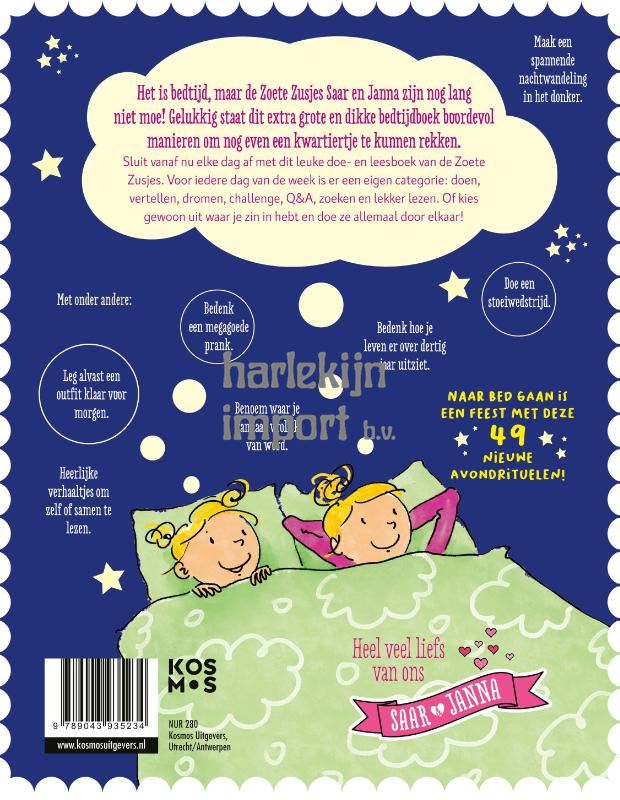 <h3>Naar bed gaan was nog nooit zo leuk!</h3> Het is bedtijd, maar de Zoete Zusjes Saar en Janna zijn nog lang niet moe! Gelukkig staat dit bedtijdboek boordevol manieren om nog even een kwartiertje te kunnen rekken. Want je kan toch niet gaan slapen zonder nog even samen te lezen, stoeien, kletsen of lachen? Sluit vanaf nu elke dag af met de Zoete Zusjes, zodat je straks heerlijk naar dromenland kunt! Perfect voor kinderen vanaf 6 jaar. Leg alvast een outfit klaar voor morgen en loop daarna nog even een modeshow in pyjama. Of toch meer zin in een leuke zoekopdracht of een grappig verhaaltje? Dit boek bevat 49 leuke activiteiten voor het slapengaan en staat daardoor 7 weken lang garant voor leuke nieuwe avondrituelen! Naar bed gaan is een feest met dit extra dikke en grote bedtijdboek! <b>Cadeautip!</b> 'De Zoete Zusjes zijn nog lang niet moe' is tevens het perfecte cadeau voor elk kind om te geven of te krijgen! Ter gelegenheid van een verjaardag, diploma, verhuizing, Sinterklaas, Kerstmis, of gewoon zomaar.