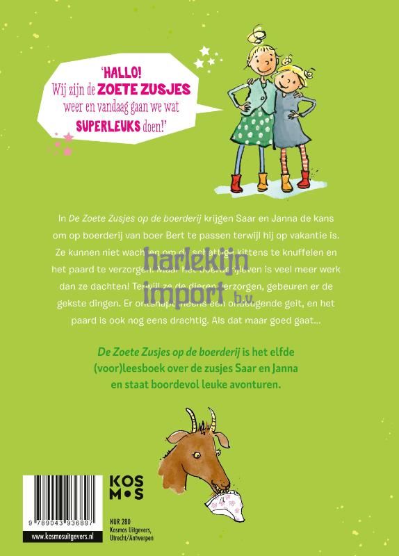 In De Zoete Zusjes op de boerderij krijgen Saar en Janna de kans om op boerderij van boer Bert te passen terwijl hij op vakantie is. Ze kunnen niet wachten om kittens te knuffelen en het paard te verzorgen. Maar het boerderijleven is veel meer werk dan ze hadden gedacht! Samen verzorgen ze de dieren, maar die zitten daar niet allemaal op te wachten, want er ontsnapt plots een geit! En het paard is ook nog eens drachtig. Als dat maar goed gaat… Gelukkig zijn papa en mama er om een handje te helpen en beleven ze met elkaar een leuk en spannend avontuur. Het nieuwste deel in de populaire kinderboekenserie van de Zoete Zusjes zorgt weer voor een heleboel leesplezier. Een verhaal vol dierenliefde en teamwork. Een heerlijk boek om voor te lezen vanaf 4 jaar of voor kinderen vanaf 7 jaar die zelf willen lezen. De uitvoering van dit (voorlees)boek is mooi gebonden, vrolijk geïllustreerd door Iris Boter en met glitters op het omslag. Dat maakt dit boek ook een perfect cadeau voor elk kind. Ter gelegenheid van een verjaardag, diploma, verhuizing, Sinterklaas, Kerstmis, of gewoon zomaar.