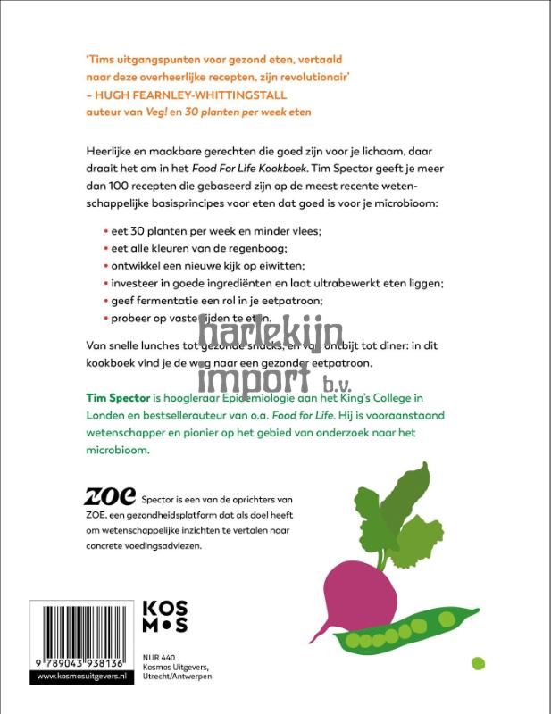 <h1>Verbeter je gezondheid met Food For Life</h1> <p> In het <em>Food for Life Kookboek</em> deelt Tim Spector baanbrekende inzichten over voeding en gezondheid. Dit kookboek, met meer dan 100 heerlijke recepten, is gebaseerd op wetenschappelijk onderzoek naar het microbioom, het ecosysteem in je darmen, en hoe dat je gezondheid beïnvloedt. Spector biedt praktische richtlijnen om je eetgewoonten te verbeteren: </p> <ul> <li>eet 30 planten per week en minder vlees;</li> <li>eet de regenboog;</li> <li>kijk anders naar eiwitten;</li> <li>investeer in kwaliteit, niet in calorierijk ultrabewerkt eten;</li> <li>geef fermentatie een rol;</li> <li>probeer op gezette tijden te eten.</li> </ul> <p> Met recepten die niet alleen goed voor je zijn, maar ook lekker, helpt dit boek je om gezondere keuzes te maken die een positieve impact hebben op je lichaam. Het boek legt de nadruk op het belang van fermentatie, goede eiwitten en kwaliteit boven kwantiteit, en helpt je met eenvoudige principes een dieet te vinden dat zowel voedzaam als smakelijk is. </p> <p> Of je nu al bekend bent met de wetenschap achter voeding of net begint, het <em>Food for Life Kookboek</em> is de ideale gids om je gezondheid te verbeteren en te genieten van lekkere, voedzame maaltijden. </p> <b> <p>Tims uitgangspunten voor gezond eten zijn revolutionair - Hugh Fearnley-Whittingstall, auteur van <em>Veg!</em> en <em>30 planten eten per week</em></b>