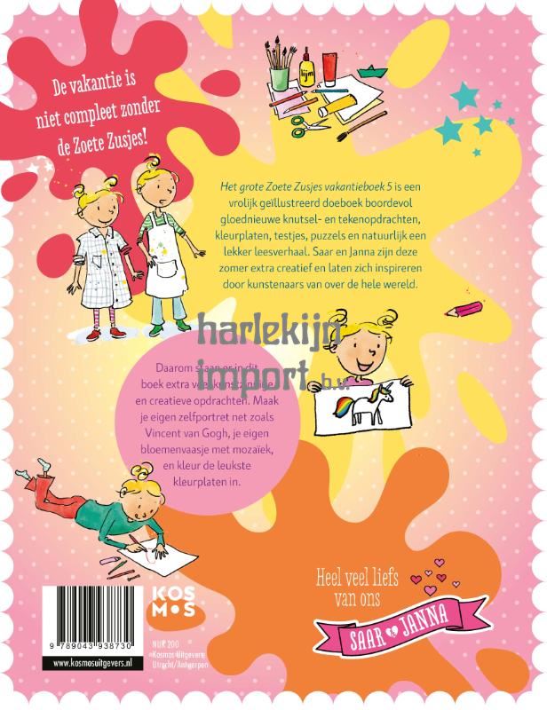 <p>De vakantie is niet compleet zonder de Zoete Zusjes! 'Het grote Zoete Zusjes vakantieboek 5' van Hanneke de Zoete is een vrolijk geïllustreerd doeboek boordevol gloednieuwe knutsel- en tekenopdrachten, kleurplaten, testjes, puzzels en natuurlijk een lekker leesverhaal. Saar en Janna zijn deze zomer extra creatief en laten zich inspireren door kunstenaars van over de hele wereld. Daarom staan er in dit boek extra veel kunstzinnige en creatieve opdrachten. Maak je eigen zelfportret net zoals Vincent van Gogh, je eigen bloemenvaasje met mozaïek, en kleur de leukste kleurplaten in.</p> <p>Met het grote Zoete Zusjes vakantieboek hoef je je deze zomer niet te vervelen!</p> <p>Luister ook naar de Zoete Zusjes podcast op Spotify, met de leukste vakantiedilemma’s, voorleesverhalen, weetjes en moppen van Saar, Janna en hun moeder Hanneke. Deze podcast is perfect voor onderweg, in de auto, het vliegtuig, de trein of op de boot! Maar ook voor op de camping, in het hotel of lekker thuis.</p>