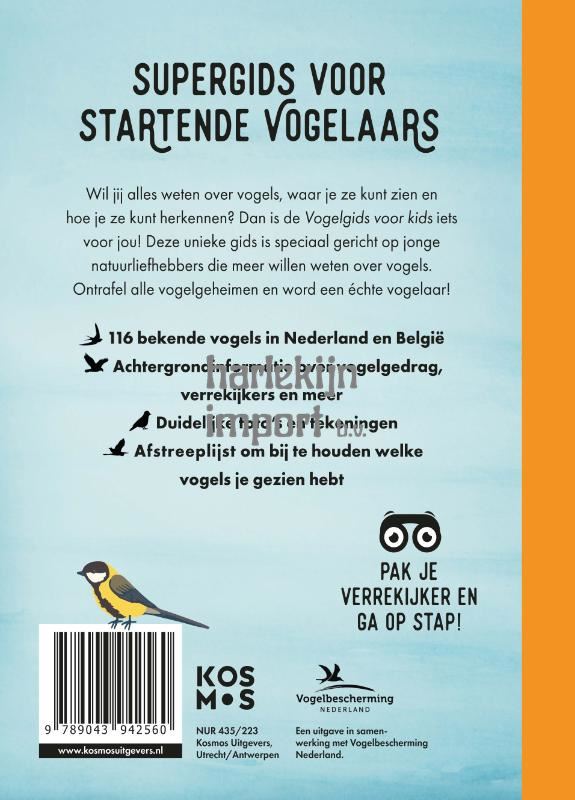 Waarom trekken sommige vogels en andere niet? Waar, wanneer en hoe kan ik vogels kijken en welke verrekijker heb ik nodig? Je vindt de antwoorden op deze en nog veel meer vragen in de ‘Vogelgids voor kids’. Deze kindervogelgids bevat veel informatie over het opzoeken en spotten van de meest voorkomende vogels in Nederland en België. Gemakkelijk leesbaar en met vele duidelijke illustraties en kleurenfoto’s! Ook leuk: deze gids heeft een afstreeplijst om bij te houden welke vogels je gezien hebt. Met een voorwoord van Camilla Dreef, ambassadeur van Vogelbescherming Nederland.