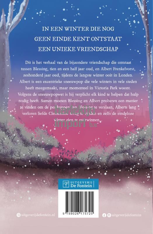 Dit is het verhaal van de unieke vriendschap die ontstaat tussen Nya, tien en een half jaar oud, en Albert Framlington, zeshonderd jaar oud, tijdens de langste winter ooit in Londen. Albert is een excentrieke sneeuwpop die vele winters in vele steden heeft meegemaakt, maar momenteel in Victoria Park woont. Samen moeten Nya en Albert proberen een manier te vinden om de pestkoppen van Nya te verslaan, Alberts lang verloren liefde Esmeralda terug te winnen en zelfs de eindeloze winter zien te overleven. Een vriendschap vol hilarische avonturen. Maar als de winter eindigt zal Albert smelten en Nya haar enige vriend verliezen…