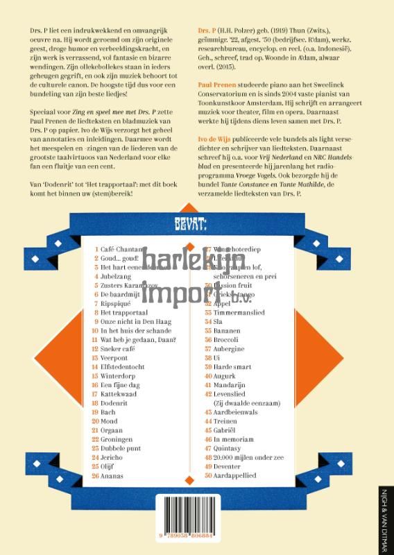 Drs. P liet een indrukwekkend en omvangrijk oeuvre na. Hij wordt geroemd om zijn originele geest, droge humor en verbeeldingskracht, en zijn werk is verrassend, vol fantasie en bizarre wendingen. Zijn ollekebollekes staan in ieders geheugen gegrift, en ook zijn liedteksten behoren tot de culturele canon. In 2019 zou de Drs. honderd zijn geworden. De hoogste tijd dus voor een bundeling van zijn beste liedjes! Speciaal voor deze unieke jubileumeditie zette Paul Prenen de liedteksten en bladmuziek van Drs P. op papier. Ivo de Wijs verzorgde het geheel van annotaties en inleidingen. Daarmee wordt het meespelen en -zingen van de liederen van de grootste taalvirtuoos van Nederland voor elke fan een fluitje van een cent. Van Dodenrit tot Trapportaal: dankzij <i>Zing en speel mee met Drs. P</i> komt het binnen uw (stem)bereik!