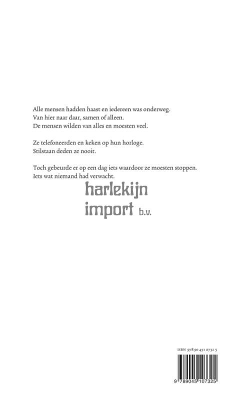 Alle mensen hadden haast en iedereen was onderweg. Van hier naar daar, samen of alleen. De mensen wilden van alles en moesten veel. Ze telefoneerden en keken op hun horloge. Stilstaan deden ze nooit. Toch gebeurde er op een dag iets waardoor ze moesten stoppen. Iets wat niemand had verwacht.