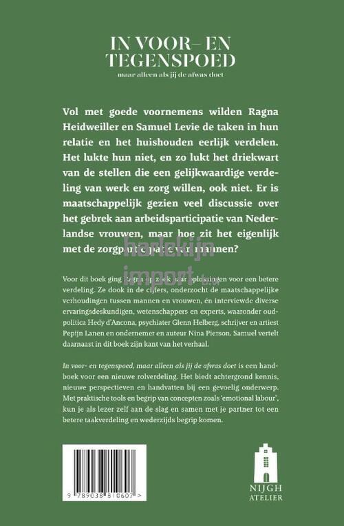 In voor- en tegenspoed, maar alleen als jij de afwas doet is een handboek voor een nieuwe rolverdeling. Het biedt achtergrond kennis, nieuwe perspectieven en handvatten bij een gevoelig onderwerp. Met praktische tools en begrip van concepten zoals ‘emotional labour’, kun je als lezer zelf aan de slag en samen met je partner tot een betere taakverdeling en wederzijds begrip komen.