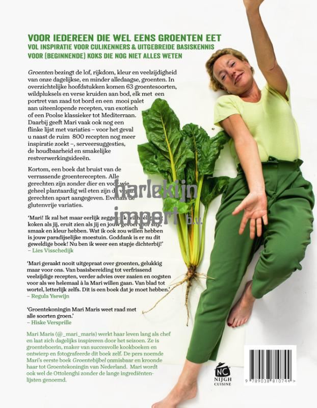 Groenten zingt de lof, rijkdom, kleur en veelzijdigheid van onze dagelijkse en minder alledaagse groenten. In overzichtelijke hoofdstukken komen meer dan vijftig groentesoorten, wildpluksels, verse kruiden en eetbare bloemen aan bod, elk met een portret van plant tot bord en een mooi palet aan uiteenlopende recepten, van exotisch of een Franse klassieker tot mediterraans. Daarbij geeft Mari vaak ook nog een flinke lijst met variaties – voor het geval u naast de ruim zevenhonderd recepten op zoek bent naar nog meer inspiratie –, serveersuggesties, informatie over de houdbaarheid en restverwerkingsideeën. Kortom, een boek dat bruist van de verrassende en veelzijdige groenterecepten. Niet zo gek als u weet dat Mari zich elke dag opnieuw laat inspireren door het aanbod van het seizoen.