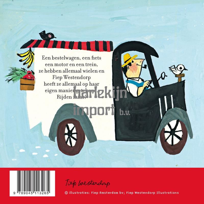 Een bestelwagen, een fiets een motor en een trein, ze hebben allemaal wielen en Fiep Westendorp heeft ze allemaal op haar eigen manier getekend. Rijden maar!