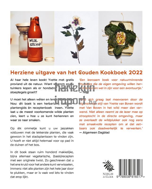 HERZIENE UITGAVE VAN HET GOUDEN KOOKBOEK VAN 2022 Een herbarium, eetbare plantengids én receptenboek ineen Al haar hele leven kookt Yvette met gratis proviand uit de natuur. Want waarom zou u tuinkers kopen als er hondsdraf tussen uw stoeptegels groeit? U moet het alleen wéten en leren herkennen. Nou: dit boek is een herbarium, eetbare plantengids én receptenboek ineen. Yvette laat u de meest voorkomende wilde planten zien, ze leert u hoe u ze kunt herkennen en waar ze naar smaken. Zo leert u wildpluk gemakkelijk toe te passen in uw eigen gerechten. Vroeger was het volstrekt normaal om te koken met de natuur direct op het bord, nu zijn we daar een beetje van vervreemd geraakt. Maar nog steeds kunt u écht op élk ommetje uw jaszakken volduwen met de lekkerste planten, die vaak gewoon in het stadsplantsoen te vinden zijn. U hoeft er niet altijd helemaal voor op pad in de duinen of het bos. Toen Yvette opgroeide maakte ze veel herbaria: ze droogde planten die ze mooi vond en plakte ze in haar vele albums. Die kinderhobby heeft ze de laatste jaren weer opgepakt: alles wat ze onderweg op haar wandelingen tegenkwam heeft ze gedroogd tussen lagen papier, karton en planken. Haar man Oof Verschuren heeft de planten én de recepten fabelachtig mooi gefotografeerd. Zo hopen Oof en Yvette opnieuw grote mensen en kleine kinderen te inspireren om zelf ook aan de slag te gaan en daardoor weer goed naar de – vaak eetbare – natuur te kijken. Achter in het boek staan meer dan honderd makkelijke, bijna allemaal vegetarische, (basis)recepten met een originele twist. Ze zijn zo geschreven dat u het ene kruid vaak voor het andere kunt verwisselen, om zo het gerecht een andere smaak te geven, immers: niet alle planten zijn het hele jaar door te plukken, maar er is vaak wel iets te vinden dat erop lijkt. ZAKBOEK Naast dit grote wildplukboek maakte Yvette ook een klein zakboek. Deze past handig in uw tas als u op pad bent. Het zakboek is de eenvoudige versie van zijn grote zus en bevat geen recepten. U vindt het onder ISBN 9789038811291.