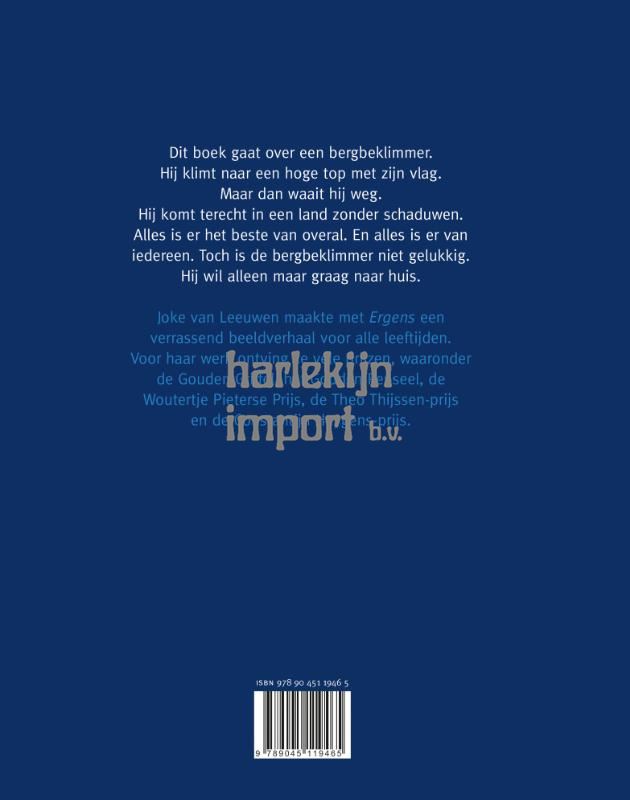 Dit boek gaat over een bergbeklimmer. Hij klimt naar een hoge top met zijn vlag. Maar dan waait hij weg. Hij komt terecht in een land zonder schaduwen. Alles is er het beste van overal. En alles is er van iedereen. Toch is de bergbeklimmer niet gelukkig. Hij wil alleen maar graag naar huis.