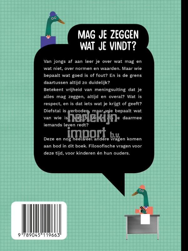 Van jongs af aan leer je over wat mag en wat niet, over normen en waarden. Maar wie bepaalt wat goed is of fout? En is de grens daartussen altijd zo duidelijk? Betekent vrijheid van meningsuiting dat je alles mag zeggen, altijd en overal? Wat is respect, en is dat iets wat je krijgt of geeft? Diefstal is verboden, maar wie bepaalt wat van wie is? Mag je liegen als je daarmee iemands leven redt?<br><br> Deze en nog heel veel andere vragen komen aan bod in dit boek. Filosofische vragen voor deze tijd, voor kinderen én hun ouders.