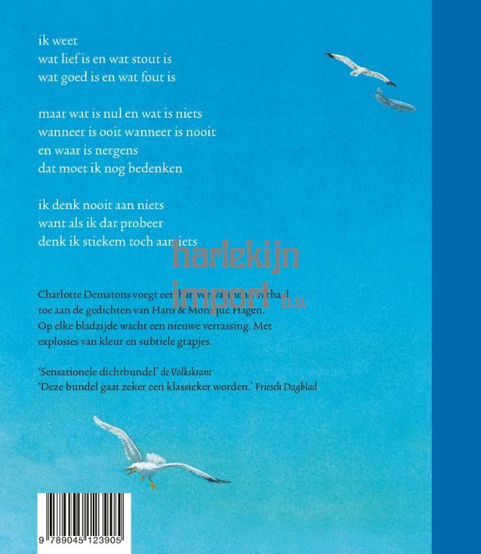 "ik weet<br> wat lief is en wat stout is<br> wat goed is en wat fout is<br><br> maar wat is nul en wat is niets<br> wanneer is ooit wanneer is nooit<br> en waar is nergens<br> dat moet ik nog bedenken<br><br> ik denk nooit aan niets<br> want als ik dat probeer<br> denk ik stiekem toch aan iets<br><br><br> Charlotte Dematons voegt een hartverwarmend verhaal toe aan de gedichten van Hans & Monique Hagen. Op elke bladzijde wacht een nieuwe verrassing. Met explosies van kleur en subtiele grapjes.<br><br> Een prachtig poëzie-prentenboek voor fans van <i>Nederland</i> en <i>Jij bent de liefste</i>. Voor alle leeftijden!"