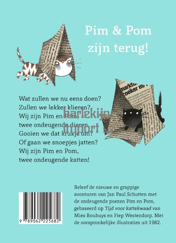 Wij zijn Pim en Pom, twee ondeugende dieren. Gooien we dat krukje om? Of gaan we snoepjes jatten? Wij zijn Pim en Pom, twee ondeugende katten! Beleef de nieuwe en grappige avonturen met de ondeugende poezen Pim en Pom, gebaseerd op de tekeningen uit Tijd voor kattekwaad van Fiep Westendorp uit 1982. Net als destijds in de verhalen van Mies Bouhuys halen Pim en Pom allerlei streken in en om hun huis uit.