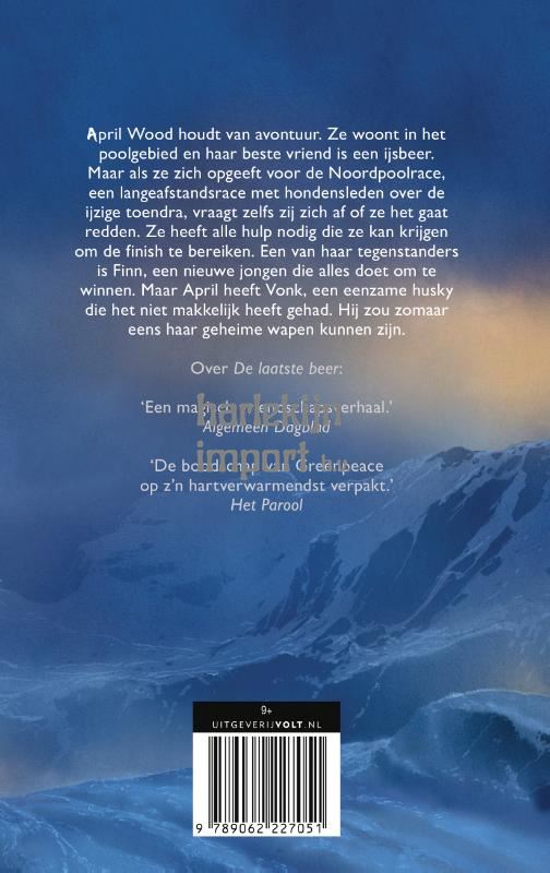 April Wood houdt van avontuur – ze woont in het poolgebied en haar beste vriend is een ijsbeer. Maar als ze zich opgeeft voor de Poolrace, een langeafstandsrace met hondensleden over de ijzige toendra, vraagt zelfs zij zich af of dit misschien een brug te ver is. April heeft alle hulp nodig die ze kan krijgen om de finish te bereiken. En dan is het ook nog een zware competitie, met ervaren hondenmenners. Onder hen is Finn, een nieuwe jongen die tot alles in staat is om te winnen. Maar April heeft Blaze: een eenzame husky met een getroebleerd verleden. Hij zou zomaar eens haar geheime wapen kunnen zijn.Over De laatste beer:‘De boodschap van Greenpeace op z’n hartverwarmendst verpakt.’ – Joukje Akveld‘Een magisch vriendschapsverhaal.’ – Algemeen Dagblad