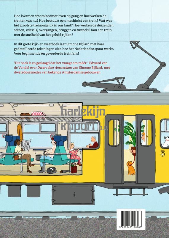 Hoe komen stoomlocomotieven op gang en hoe werken de treinen van nu? Hoe bestuurt een machinist een trein? Wat was het grootste treinongeluk van Nederland? Hoe werken de duizenden seinen, wissels, overgangen, bruggen en tunnels in ons spoor? Kan een trein rijden over spoor dat er nog niet ligt? Simone Bijlard weet overal antwoord op en maakt alles inzichtelijk met haar heerlijk gedetailleerde illustraties met dwarsdoorsnedes en overzichten. Wie nog geen treinfanaat is, wordt het nu!