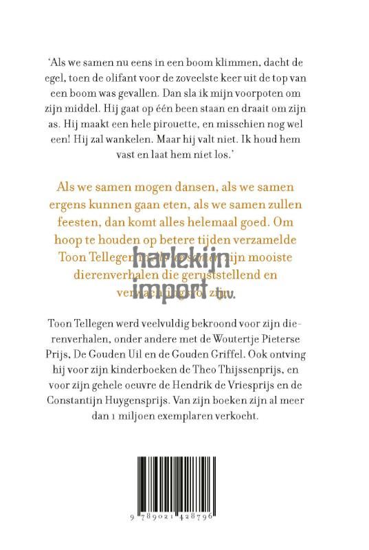 ‘Als we samen nu eens in een boom klimmen, dacht de egel, toen de olifant voor de zoveelste keer uit de top van een boom was gevallen. Dan sla ik mijn voorpoten om zijn middel. Hij gaat op één been staan en draait om zijn as. Hij maakt een hele pirouette, en misschien nog wel een! Hij zal wankelen. Maar hij valt niet. Ik houd hem vast en laat hem niet los.’ Als we samen mogen dansen, als we samen ergens kunnen gaan eten, als we samen zullen feesten, dan komt alles helemaal goed. Om hoop te houden op betere tijden verzamelde Toon Tellegen in Als we samen zijn mooiste dierenverhalen die geruststellend en verwachtingsvol zijn.